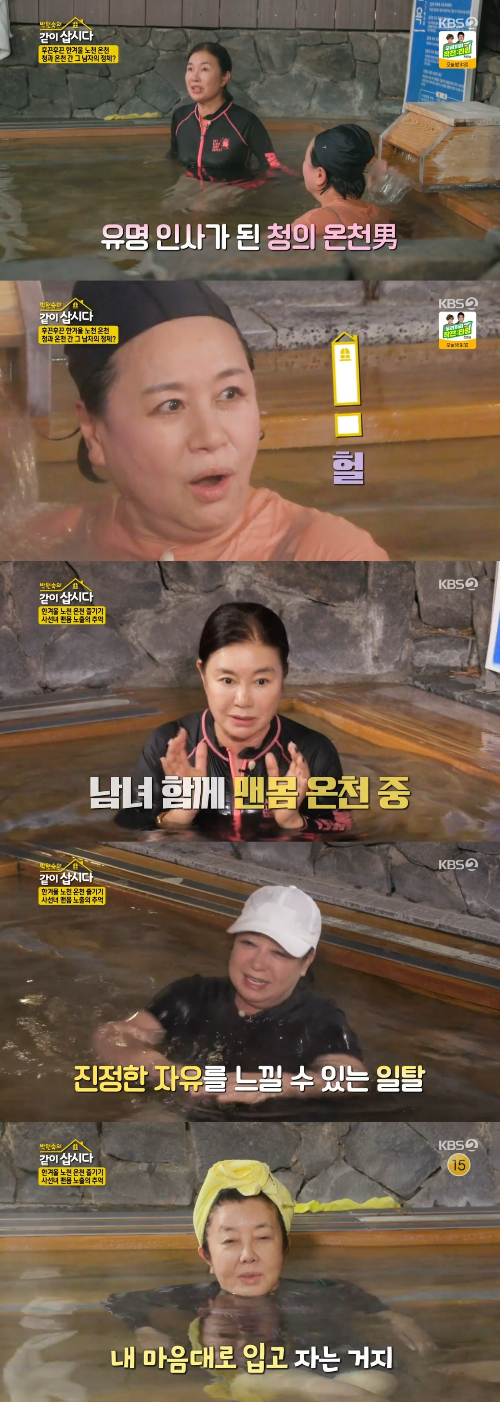 이후 혜은이와 김영란도 합세했다. 김청은 온천에 관한 일화를 꺼냈다. 김청은 "캐나다에서 유명한 온천이 있어. 실내를 갔는데 너무 놀랐어. 남자 여자 벗고 다 같이 있다"고 설명했다. 이어 "근데 거기서 너무 유별나게 나오기가 그렇잖아. 아무렇지 않다는 듯 나왔지. 혼자 옷 입고 있는 게 이상할 정도였다"라고 덧붙였다.