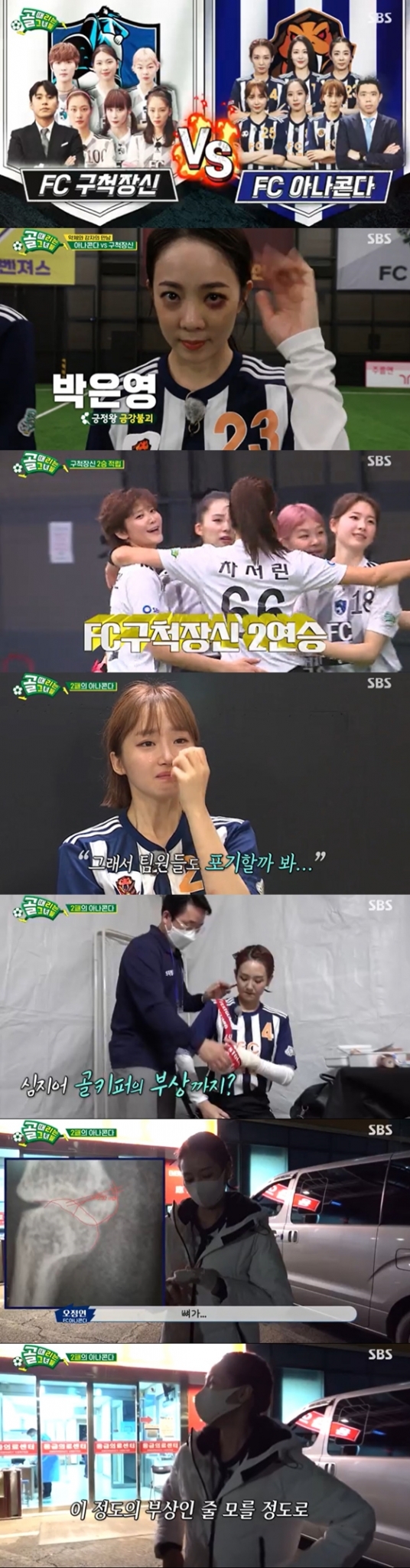 경기를 끝난 후 응급실을 찾아 엑스레이를 찍었던 오정연. 그는 왼손 약지에 깁스를 한 채 응급실을 나왔다. 앞서 FC구척장신의 연이은 슛을 막아냈던 오정연이었다. 그는 제작진에게 "골절됐다"라면서 "뼈가. 인대가. 속상해"라고 말했다. 이어 "이럴 줄 몰랐는데"라면서 눈물을 훔쳐 안타까움을 자아냈다.