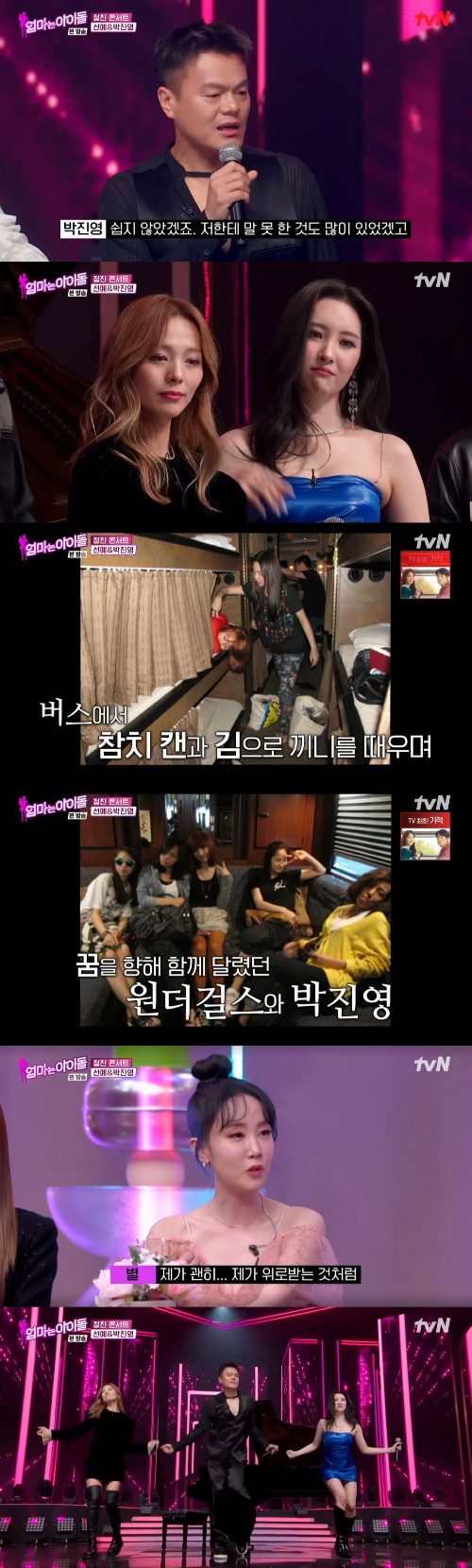 20일 오후 방송된 tvN '엄마는 아이돌'에서는 선예의 절친으로 선미가 합세해 '가시나'로 파격적인 무대가 펼쳐졌다. 이후 선예의 두 번째 절친으로 박진영이 무대에 오르는 모습이 그려졌다.
