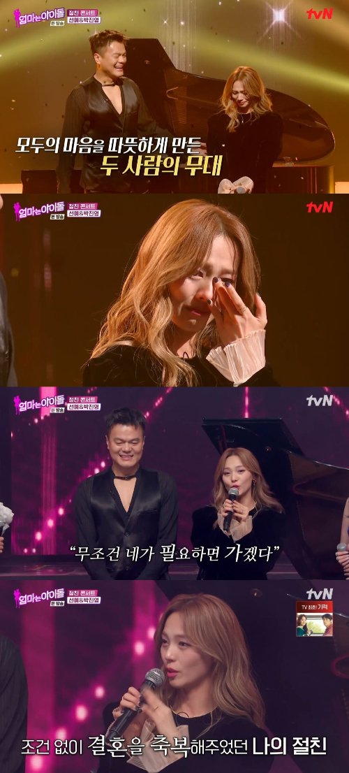 선예는 박진영에 대해 "제 인생에 중요한 순간에 있어서 늘 계셨던 분이고 오늘도 흔쾌히 네가 필요하다면 가겠다고 해주셨다"라며 "원더걸스 활동을 그만두고 결혼을 선택했을 때도 아무런 조건 없이 저를 축복해주신 너무 감사한 분이다"며 고마움을 전했다.