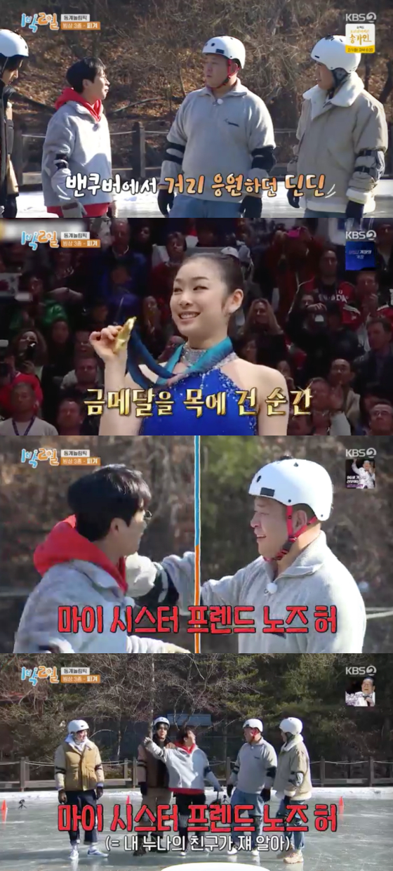 이날 멤버들은 피겨스케이팅 대회를 펼쳤다. 자연스레 '연느' 김연아 선수의 이름이 거론되자 딘딘은 "벤쿠버 올림픽 때 나 벤쿠버에 있었다"며 호들갑을 떨었다.