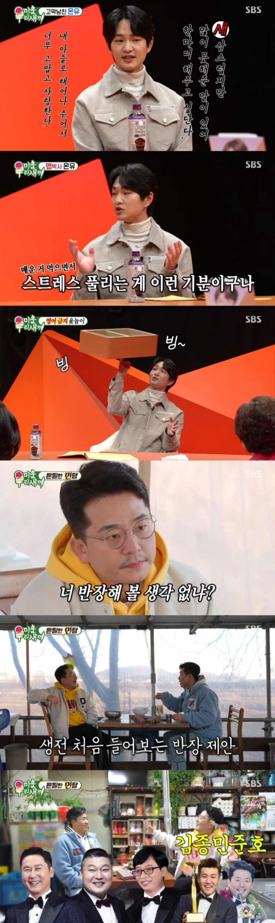 이어 온유가 '아재개그 덕후'라는 말에 MC 신동엽은 '미우새'로 삼행시를 요청했다. 흔쾌히 수락한 온유는 삼행시로 거의 수필 수준의 긴 문장을 읊고 추신까지 덧붙여 모두를 당황케 했다.