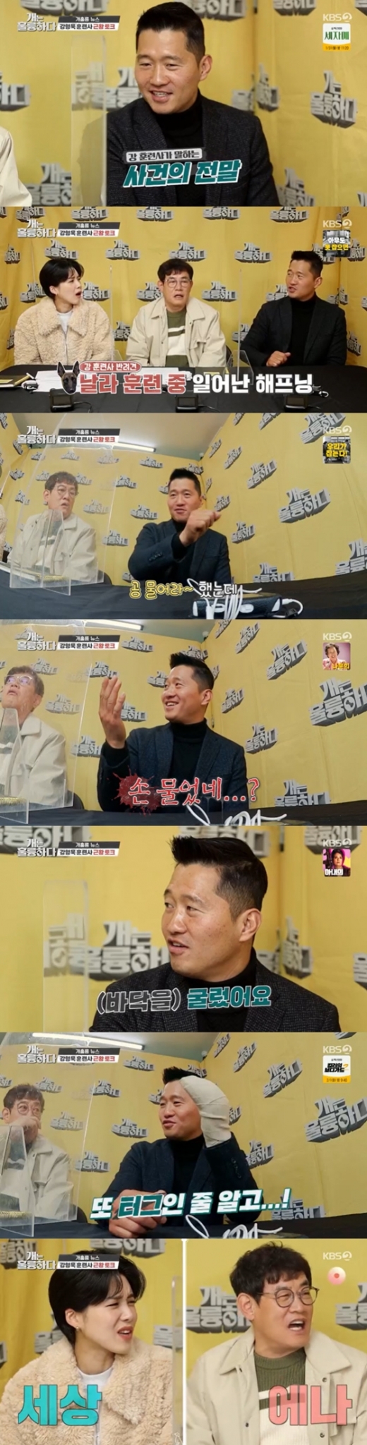 24일 오후 방송된 KBS 2TV '개는 훌륭하다'에서 장도연이 오프닝을 하면서 강형욱 훈련사의 손을 보고 많이 놀랐다고 했다.