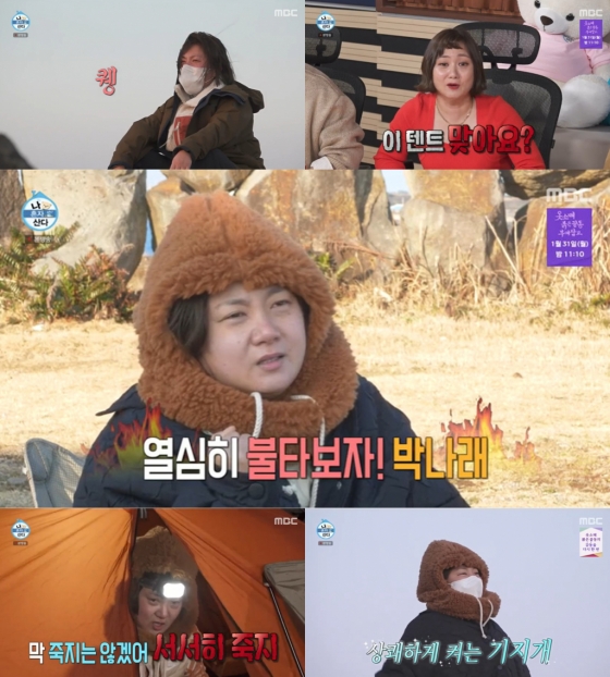 이어 박나래는 텐트 조립을 위해 고군분투하며 웃음을 안겼다. 김숙에게 빌려온 낯선 텐트에 당황한 그녀는 주변 백패커들에게 도움을 요청해 안락한 보금자리를 얻었다. 그러나 모습을 갖춰가는 텐트에 만족스러움을 느낀 것도 잠시, "추워서 막 죽지는 않겠다. 서서히 죽지"라며 앓는 소리를 내 폭소를 자아냈다.