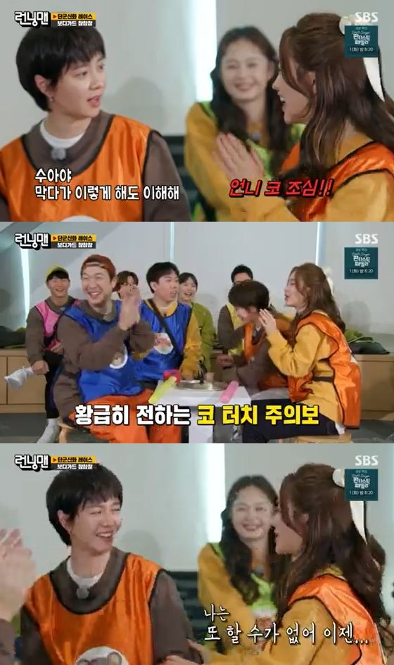 이날 하하X양세찬 팀과 송지효X홍수아 팀이 가장 먼저 맞붙었다. 송지효는 "막다가 (얼굴을) 이렇게 해도 이해해 줘"라고 말했고, 홍수아는 "언니 코 조심"이라며 자신의 코를 가리켜 웃음을 자아냈다.