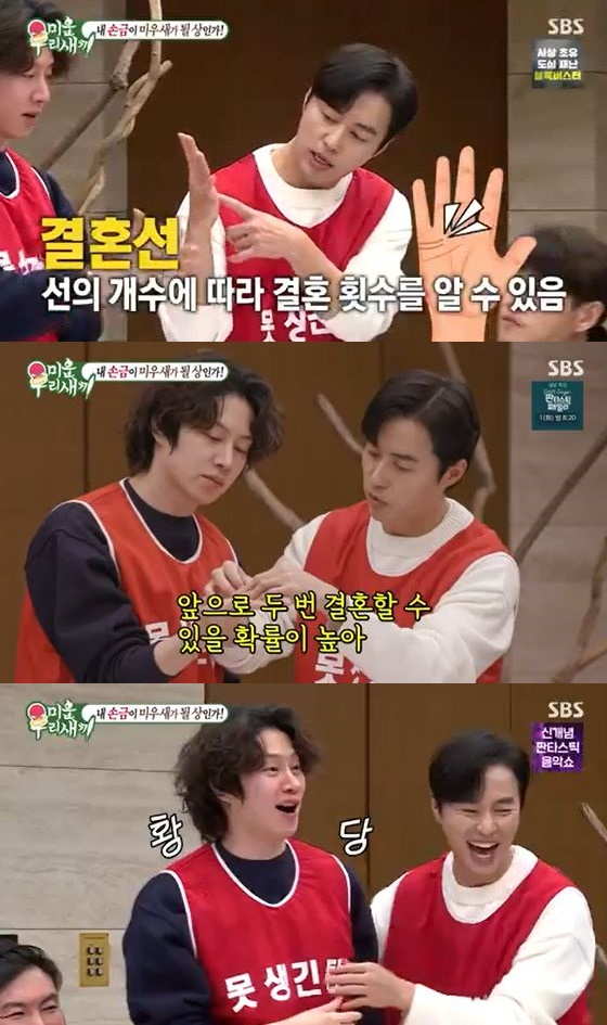 이날 오민석은 "새해니까 결혼선 손금을 봐주겠다"고 나섰다. 오민석은 오른손에 결혼선이 있다며, 결혼선 2개가 있다면 재혼할 가능성이 높다고 설명했다. 실제로 '돌싱'인 이상민과 김준호, 임원희, 탁재훈은 모두 결혼선을 2개 이상 갖고 있었다.