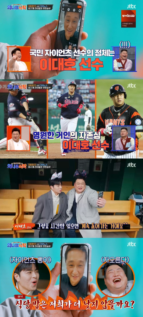 3일 오후 방송된 JTBC '외나무식탁'에서는 롯데 자이언츠와 NC 다이노스의 요리사들이 맛 대결이 펼쳐졌다. 김준현은 롯데 자이언츠 이대호 선수와 영상통화를 연결했다.