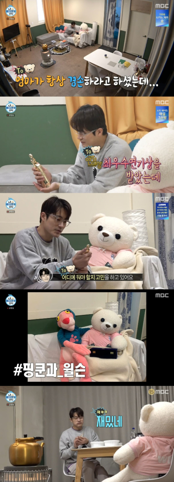 이날 차서원은 '나 혼자 산다'의 공식 마스코트 윌슨(곰 인형)과 핑크팬더에 담요를 덮어주며 "좀 쑥스럽긴 하다. 엄마가 항상 겸손하라고 하셨는데…"라며 말문을 열었다.