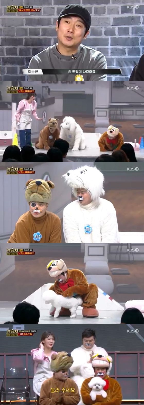 5일 오후 방송된 KBS 2TV 예능 프로그램 '개승자'에서는 이수근, 유남석, 김민수, 고유리의 '개는 훌륭하다' 개그가 공개됐다.