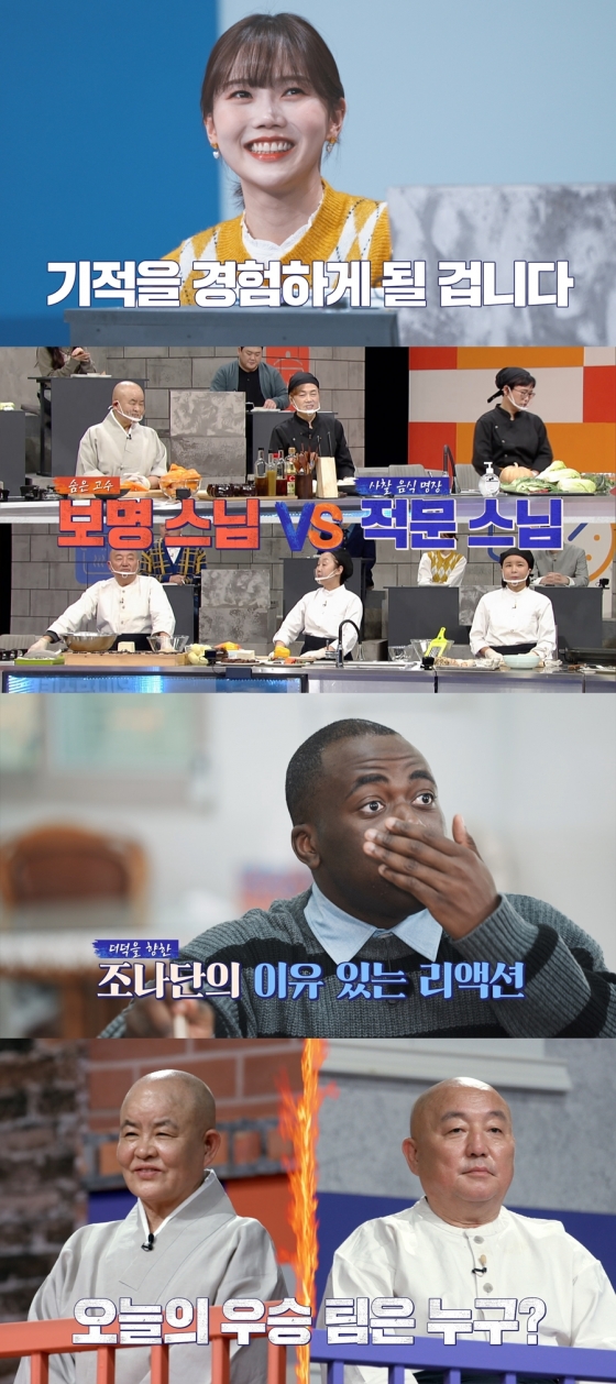 상대팀인 보명스님의 음식 역시 만만치 않다고. 먹방 계의 다크호스 조나단은 더덕 고추장 구이를 먹자마자 절제가 안 되는 맛이라며 순식간에 밥을 흡입한다. 이를 지켜본 강호동과 김준현은 "진짜 맛깔나게 잘 먹는다"며 새로운 먹방 인재의 등장에 놀라움을 감추지 못한다.