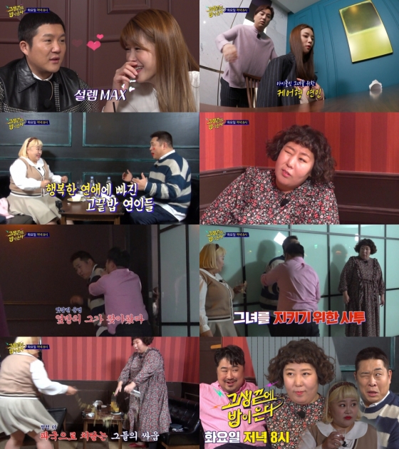 그러나 옆방에 있던 문세윤이 강재준과 신기루의 방을 찾아왔고, 신기루는 "옛날에 나 사귀었던 사람하고 닮았다"라며 문세윤에게 윙크를 날렸다. 두 사람 사이에 묘한 기류가 흐르자 강재준은 분노하며 "무슨 사이야?"라며 문세윤을 구석으로 몰며 문세윤과 사투를 벌였다. 이어 문세윤이 강재준에게 물을 뿌리자, 신기루는 문세윤에게 물을 뿌리며 복수했고, 여기에 문세윤의 파트너인 홍윤화까지 참전해 신기루에게 주스를 끼얹었다. 사랑을 지키기 위한 이들의 싸움은 어떻게 끝을 맞았을지 궁금증을 높인다.