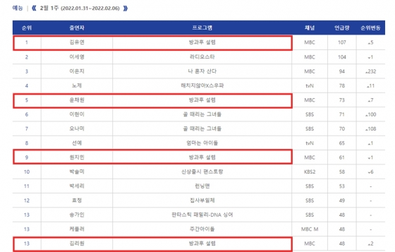 지난 7일 한국방송광고진흥공사 방송콘텐츠 가치정보 분석시스템 라코이(RACOI)에 따르면 '방과후 설렘' 출연자인 4학년 김유연, 윤채원 연습생과 2학년 원지민, 김리원 연습생은 연습생들은 2월 1주차 (2022년 1월 31일~2022년 2월 6일) 인터넷 반응 예능 부문 출연자 순위에 이름을 올렸다.