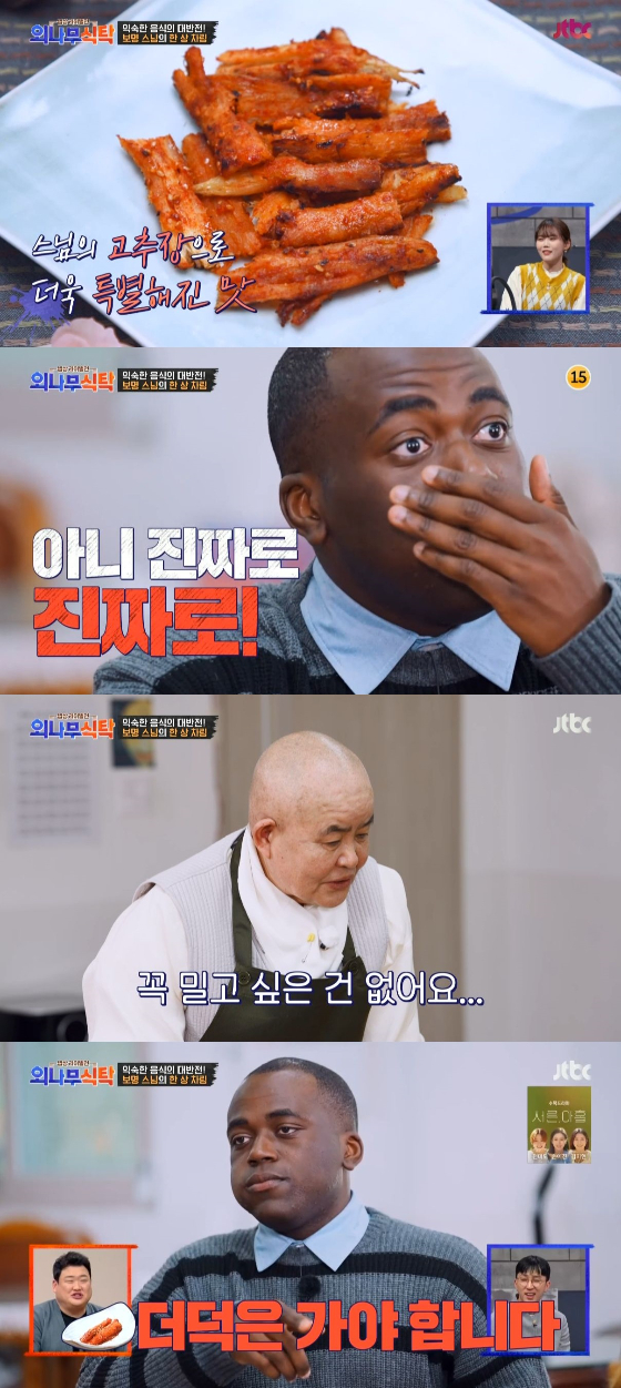 이날 방송에서 보명스님은 특제 고추장 더덕구이를 선보였다. 이를 맛본 조나단은 "너무 맛있는데? 이거 큰일 났다"며 감탄사를 연발했다.