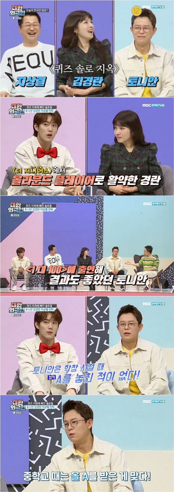 '대한외국인'에서 가수 토니안과 아나운서 출신 방송인 김경란, 개그맨 지상렬이 '솔로특집'에 출연했다.