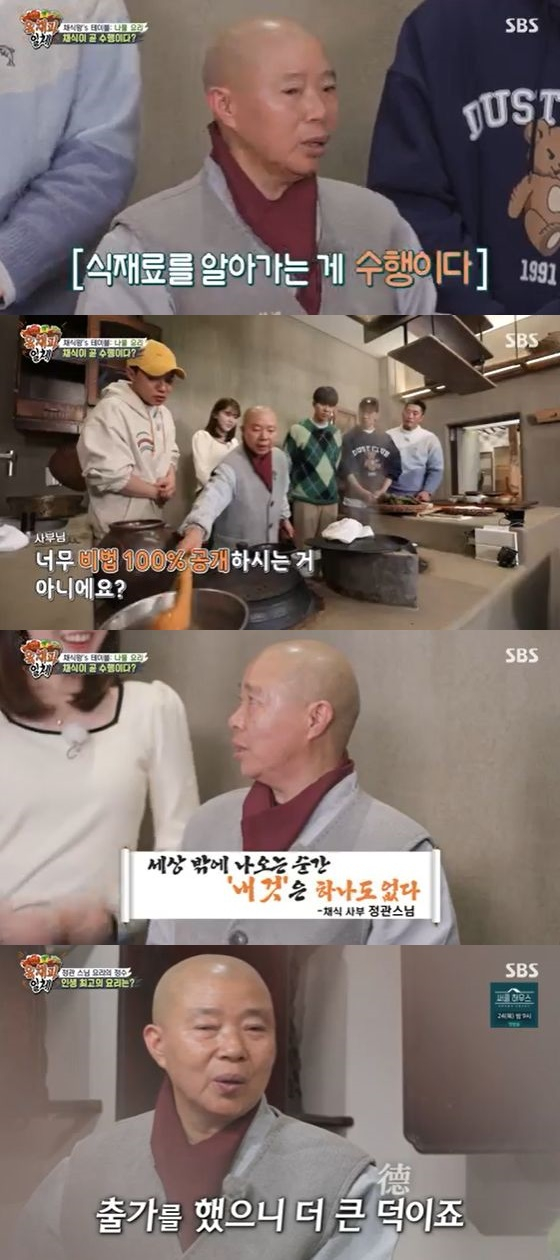 멤버들은 "오늘 비법을 다 공개해주시는데 괜찮으신지" 물었다. 이에 정관스님은 "비법은 마음에서 나오는 거다. 세상 밖에 나오면 내것이란 하나도 없다"라고 전해 멤버들을 감탄케 했다.