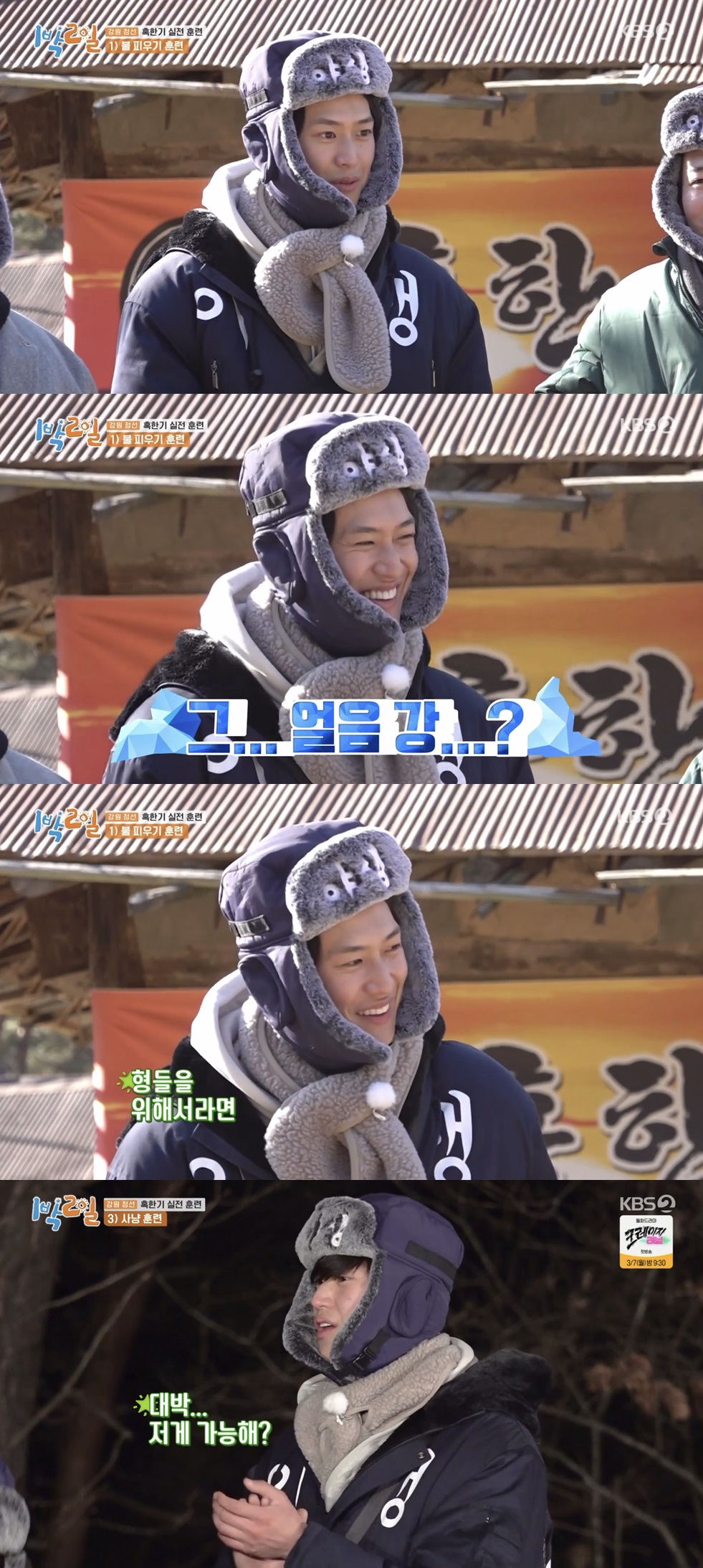먼저 나인우는 혹한기 실전 훈련으로 점심 식사를 걸고 불 피우기 미션에 도전, 허무하게 끝나버린 첫 도전에 김종민은 얼음강 입수를 제안했다.