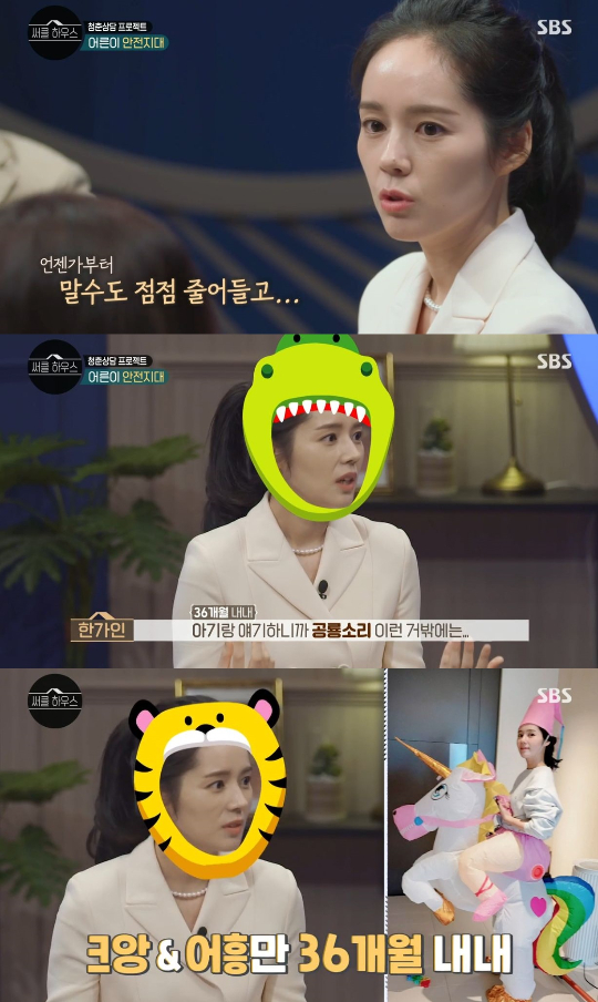그러면서 한가인은 "그런데 얘네가 저와 유착관계가 생기고 정서가 안정될수록 내가 불안정해졌다. 실제로 불안장애가 와서 상담받은 적도 있다. 원래 웃음도 많고 장난도 많은 성격이었는데 어느 날부터 말수도 줄어든다"라면서 "아기랑만 얘기하다 보니 공룡 소리나 호랑이 소리 밖에 낼 게 없다. 맨날 티라노랑 산다. 지금 여기서는 말 할 수 있어서 너무 좋다"고 말해 웃음을 자아냈다.