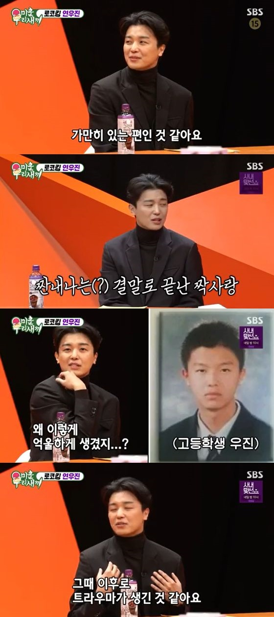 연우진은 학창 시절에는 인기가 없는 편이었다고 말했다. 연우진은 "하루는 학원에 미리 가서 엎드려있었다. 이성친구들이 들어오며 제 이야기를 하더라. 제 본명이 '김봉회'인데, 별로라고 험담을 했다. 그 뒤로 트라우마가 생긴 것 같다"라며 안타까운 사연을 공개했다.