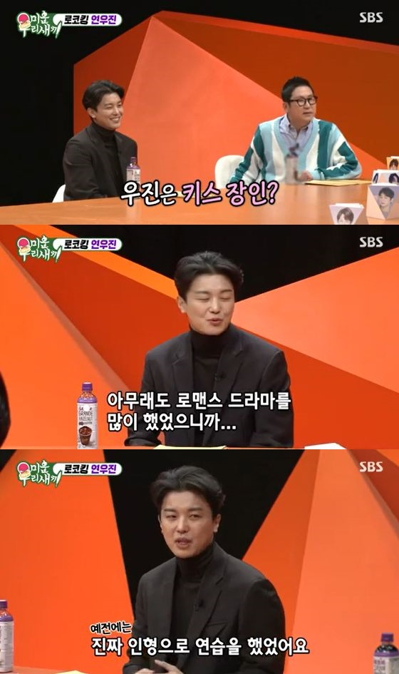 한편 신동엽은 연우진을 '키스 장인'이라고 소개했다. 연우진은 "로맨스 드라마를 많이 해서 그런 것 같다"라며 머쓱해 했다. 연우진은 "예전에는 진짜 인형으로 키스 연습을 했었다"고 덧붙였고, 신동엽은 "그럼 입을 뚫어놓고?"라며 너스레를 떨었다.