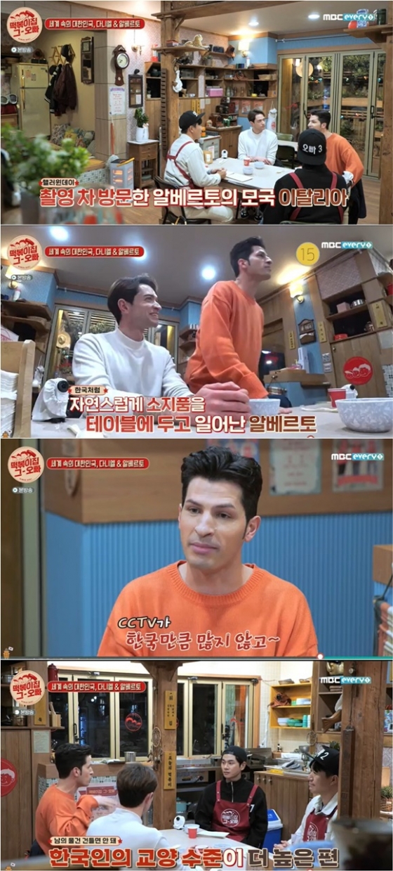 알베르토는 "이탈리아에서 촬영을 하고 저녁 매니저랑 클럽에 갔다. 지갑이랑 휴대폰을 테이블에 두고 화장실 가다가 순간 '미쳤나' 싶어서 다시 돌아갔다. 한국에서는 오히려 자리 지키려고 휴대폰 테이블에 두고 가는데 이탈리아에서는 다 가져간다"고 말했다.