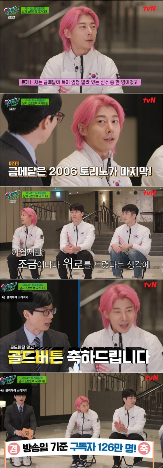유재석은 "무엇보다 이번에 골드버튼 축하한다. 구독자가 126만이냐"라고 물었다. 곽윤기는 "올림픽 전에는 16만이었다"며 구독자가 8배 증가했다고 밝혔다.