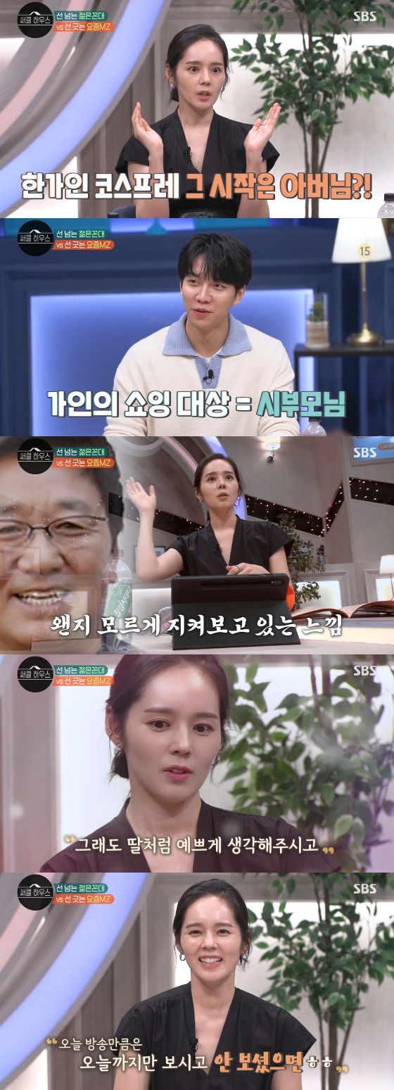이어 한가인은 "이 프로그램 하면서 '이 말을 해도 될까, 안 될까'라고 필터링을 할 때 (시)아버님이 말풍선처럼 머리 위에 떠 있다"며 "제가 조금 방정스러울 때가 있거든요. 그럼 '아 이럼 안 되지'라는 생각을 하게 된다"고 전했다. 이승기는 "한가인 코스프레?"라고 장난쳤고, 한가인은 "한가인 코스프레다"며 인정했다.