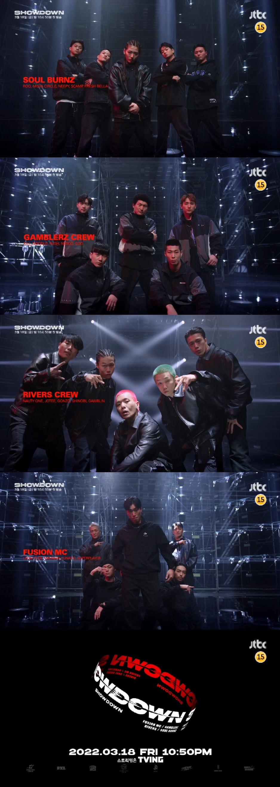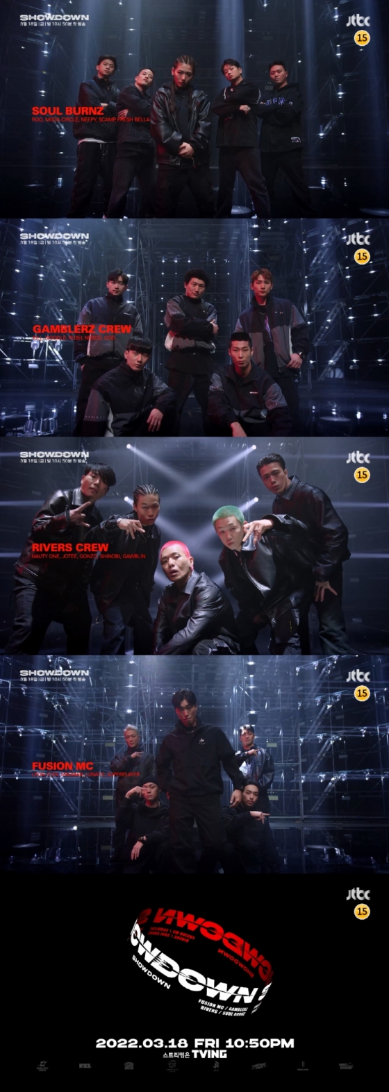 7일 공개된 크루 소개 티저 영상 1탄에는 '쇼다운'을 통해 치열한 배틀을 벌일 리버스크루(조티, 곤조, 너리원, 고블린, 시노비), 갬블러크루(누들, 러쉬, 킬, 네스코, 고그), 퓨전엠씨(플렉스, 매드맨, 루나틱, 슈퍼플레이어, 레온), 소울번즈(루, 미스타 써클, 스캠프, 프레시 벨라, 니피)까지 4개 크루의 강렬한 포스와 입이 떡 벌어지는 화려한 기술을 만날 수 있어 관심을 높이고 있다.