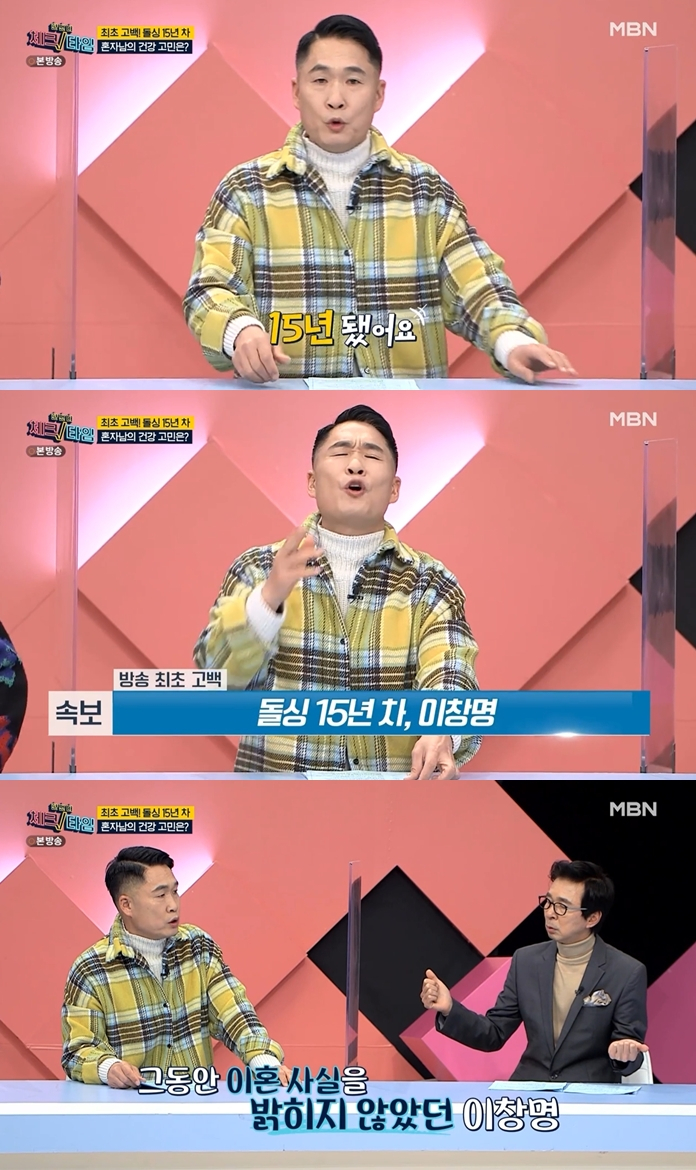이창명은 지난 7일 방송된 MBN '한번 더 체크타임'에 게스트로 출연해 이혼 사실을 알렸다. 이창명은 이날 "혼자된 지 오래됐다고" 묻는 MC 김수용의 말에 "15년 됐다. 처음 얘기하는 거다"고 '돌싱 15년차'임을 밝혔다.
