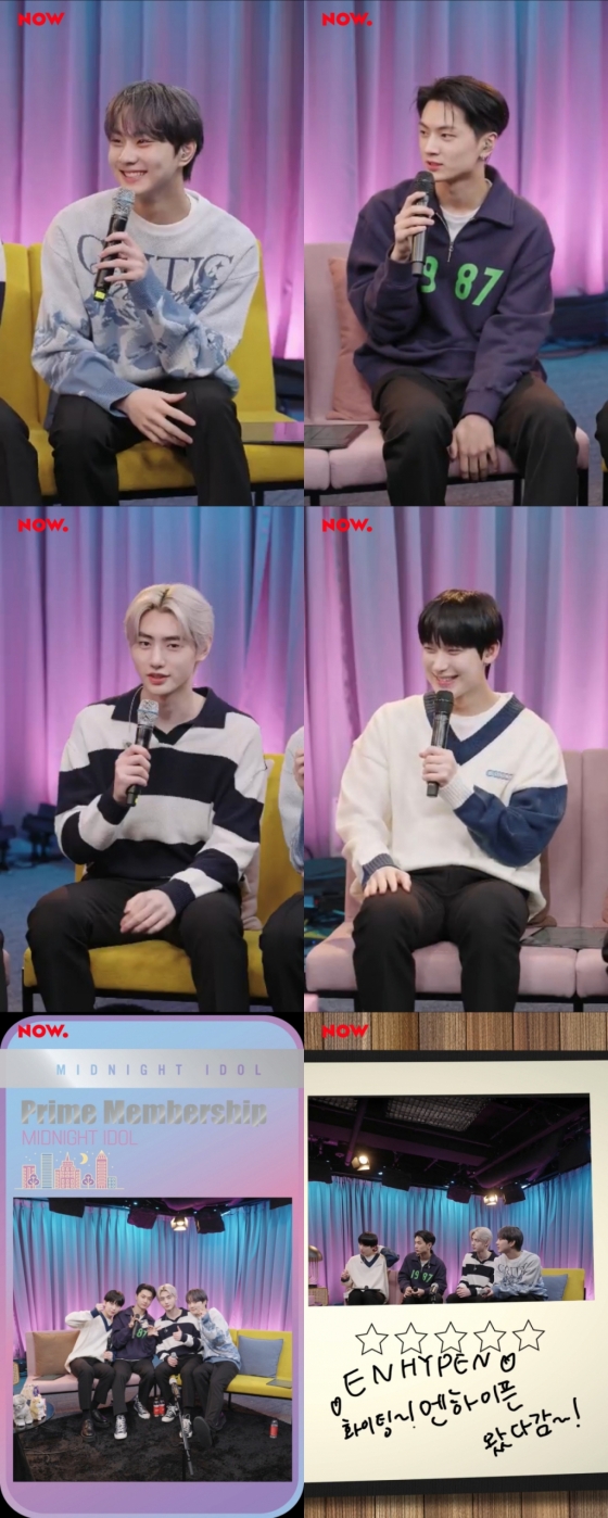 ENHYPEN(정원, 희승, 제이, 제이크, 성훈, 선우, 니키)의 정원, 제이, 성훈, 선우는 지난 7일 방송된 네이버 NOW. '심야아이돌'에 출연해 다양한 이야기를 나누며 청취자들과 소통했다. '심야아이돌'은 몬스타엑스 기현과 아이엠이 호스트로 진행을 맡은 라이브쇼다.