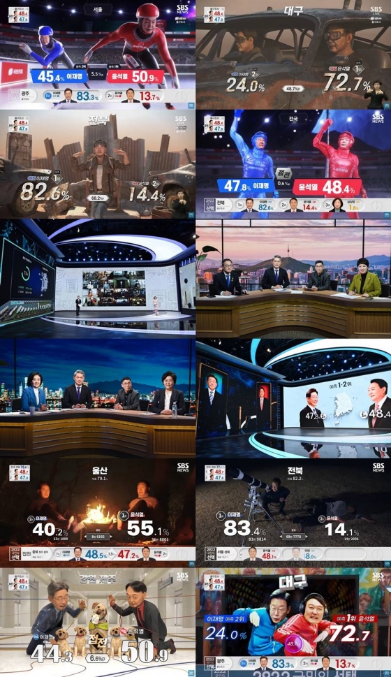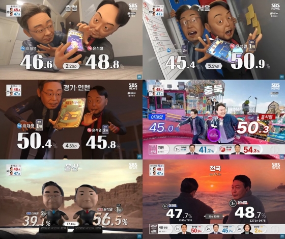 SBS 놀이동산 '디스코 팡팡', 사막을 달리는 질주씬, 유권자들의 바람을 담은 카드를 갖기 위한 추격전 '캐치(Catch)' , 애니메이션에 사진을 합성해서 코믹화해 왔던 기존 방식에서 다변화하여 하늘에서 전국을 촬영하여 각 지방의 특색을 살린 '에어', MZ 세대와의 소통을 강조한 메타버스 등 화려한 그래픽을 선보여 본격적인 개표방송에 대한 기대감을 한껏 살렸다.