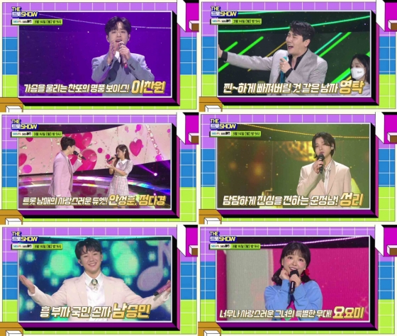 14일 방송되는 '더 트롯쇼'에는 이찬원, 영탁, 남승민, 안성훈, 정다경, 도야성, 공훈, 나영, 성리, 이미리, 금잔디, 정윤희, 김성기, 장송호, 요요미, 미니마니가 함께하며, 밤 9시 SBS FiL과 SBS MTV에서 만나볼 수 있다.