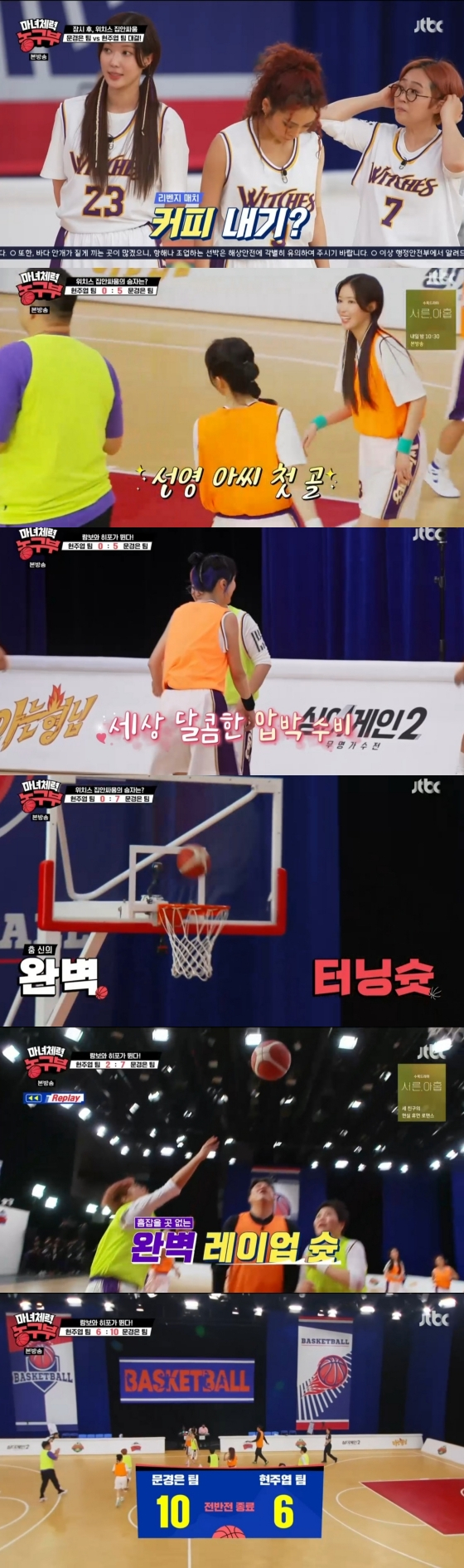 15일 오후 방송된 JTBC 예능프로그램 '언니들이 뛴다-마녀체력 농구부'에서는 '위치스' 선수들이 문경은 팀과 현주엽 팀으로 나뉘어 대결을 펼쳤다. 현주엽 팀은 고수희, 송은이, 옥자연, 장도연으로, 문경은 팀은 별, 박선영, 임수향, 허니제이로 각각 구성됐다.