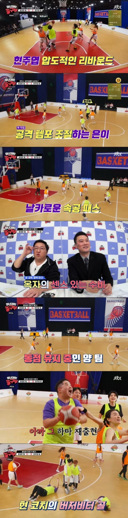 하지만 송은이가 깔끔한 레이업 슛을 선보이며 현주엽 팀의 첫 득점을 올리기 시작하자 침체됐던 분위기는 다시 올라왔다. 특히 현주엽은 연이은 리바운드와 하마같은 포스로 문경은 팀 멤버들을 놀라게 했다.