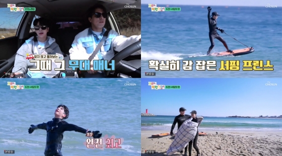 본격적인 서핑에 앞서 정동원은 이찬원과 전화 통화를 시도해 눈길을 끌었다. 정동원은 이찬원에게 "형한테 물어볼 게 있다"며 말을 꺼냈고, 장민호는 "잠깐만, 나도 말할 게 있다"며 가세해 투닥거리는 모습으로 폭소를 안겼다.