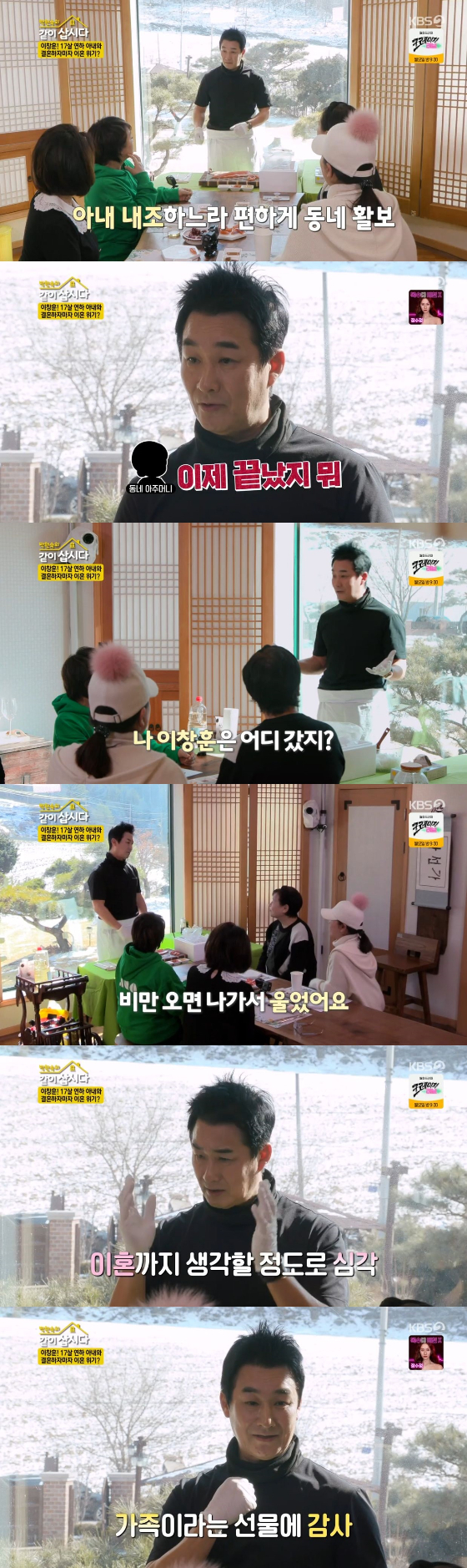 이창훈은 "그때 정체성 혼란이 왔다. 못 살겠다는 생각이 들더라. 방황하게 되면서 이혼까지 생각하게 됐다. 근데 나중에 달리 생각하게 됐다. 세상에 다 가질 수 없는 대신 가장 소중한 가족을 얻은 거라고 받아들이게 됐다"라고 말하며 훈훈함을 자아냈다.