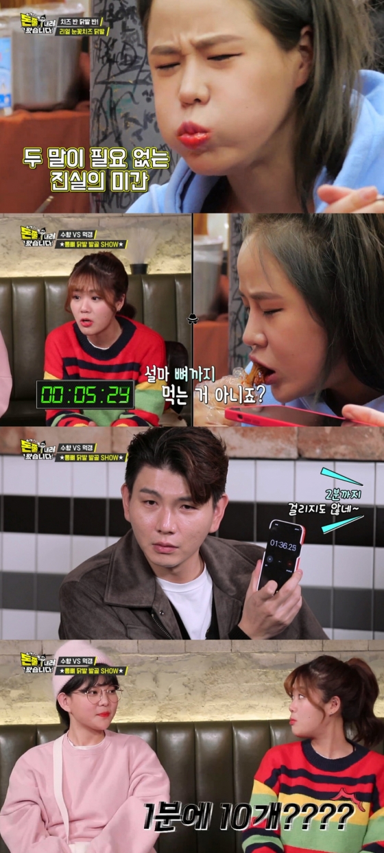 특히 수향은 닭발 10개를 2분 만에 먹는 '미리내' 미션에 성공해 '닭발 여신' 타이틀을 획득한다. 하지만 이를 상황실에서 지켜보던 먹갱이 "난 1분이면 가능하다"라며 도전장을 내밀어 녹화 현장 분위기를 한껏 달아오르게 만들었다는 후문이다.