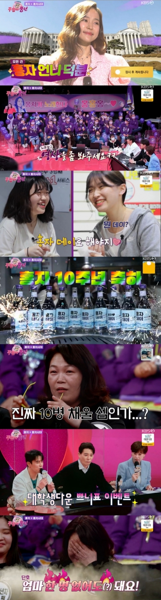 이어 친구들을 만난 대학생 '찐' 팬 '쁘니'는 "홍자언니가 10주년이니까 오늘 소주 10병 마셔야 한다"고 밝혀 친구들을 당황하게 했다. 장민호는 "실제로 10병을 마신 거냐"라며 놀라워했고, 이에 홍자시대 '쁘니'는 "일단 마시고 친구 집에 가서 2차로 더 마셨다"라고 답해 웃음을 안겼다. 패널로 자리한 '쁘니'의 엄마에게 박미선은 "해주고 싶은 이야기 있냐"라며 인터뷰를 시도했고, '쁘니'의 엄마는 딸에게 육두문자를 던져 폭소케 했다. 특별 MC로 출연한 이진혁은 "방송을 하다가 이런 말 들은 건 처음이네요"라고 말해 재미를 더했다. '쁘니'의 동생 역시 패널로 참석한 가운데, 그는 "누나가 홍자 닮고 싶다고 했지 않냐. 술 많이 마시는 거 보니까 홍자누나는 못 될 것 같다"라고 단호히 말해 웃음을 줬다.