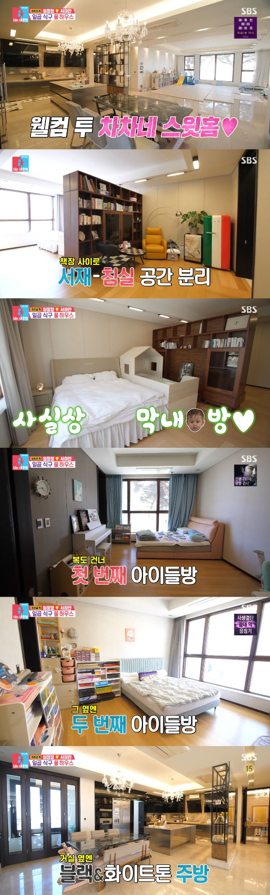 이날 방송에서 임창정 부부의 일곱 식구 풀하우스가 공개됐다. 널찍한 화이트톤의 거실과 거실 옆엔 블랙&화이트 톤 주방이 돋보였다. 안방은 책장으로 침실과 서재를 분리해 놓았다. 부부침실 옆엔 막내아들의 침대도 함께 있었다. 이어 깔끔한 아이들 방도 잘 정돈되어있었다.