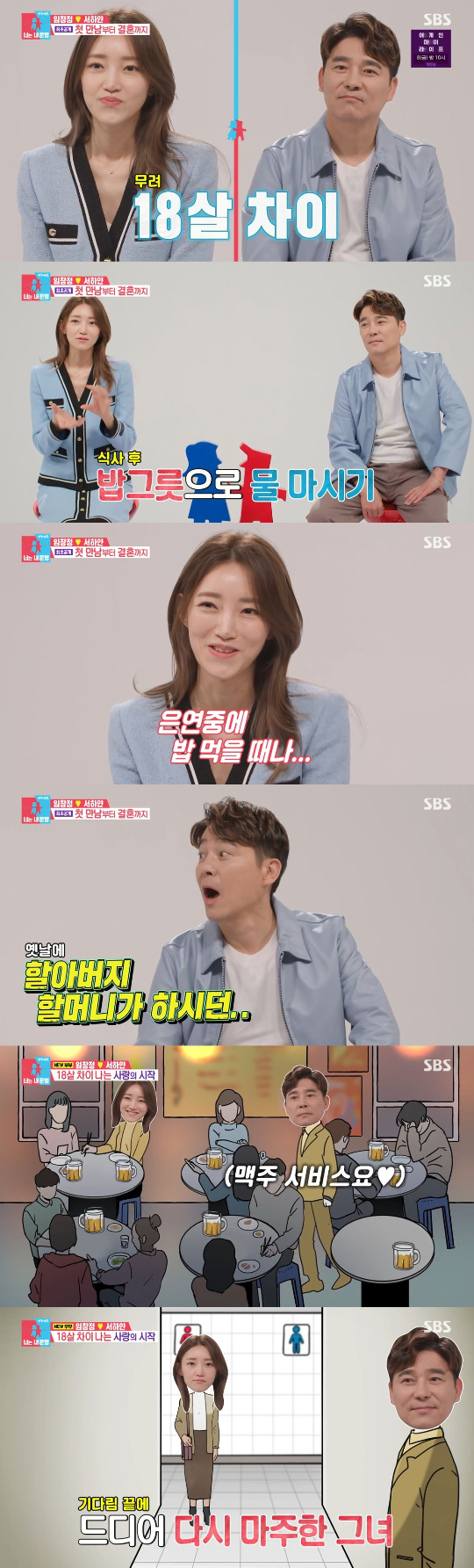 임창정은 "근데 그 말을 해야겠다는 걸 까먹고 맥주 한 잔 사달라고 했다. 그 말에 빵 터져서 웃더라. 그게 첫 만남이었다. 그러고 아무렇지 않은 척 내 자리 가서 앉았는데 가슴이 막 계속 뛰더라. 아내가 화장실을 가자, 나도 따라갔다. 화장실에서 나오면 말 걸려고 계속 기다렸다. 아내가 나오자 '어?'라고 아는 척을 했다"며 당시를 회상했다. 이에 서하얀은 "이거 아니다. 짝다리 짚고 '키가 몇이에요?'라고 물어보더라. 질문하는 순간. 이 사람이 나한테 관심이 있는 걸 알았다. 뭘 더 물어보고 싶어 했던 뉘앙스는 있었는데 키 얘기만 하고 각자 자리로 들어갔다"라고 정정했다.