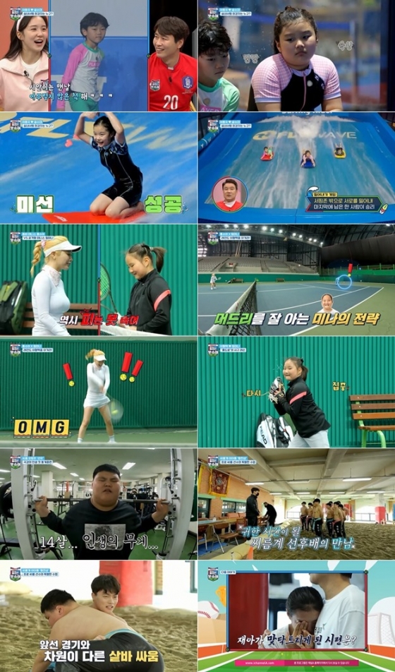 '시구 퀸' 홍수아와 '씨름계 아이돌' 황찬섭이 '테니스 유망주' 미나, '씨름 꿈나무' 선우와 깜짝 대결을 벌이며 이들의 꿈을 응원했다.