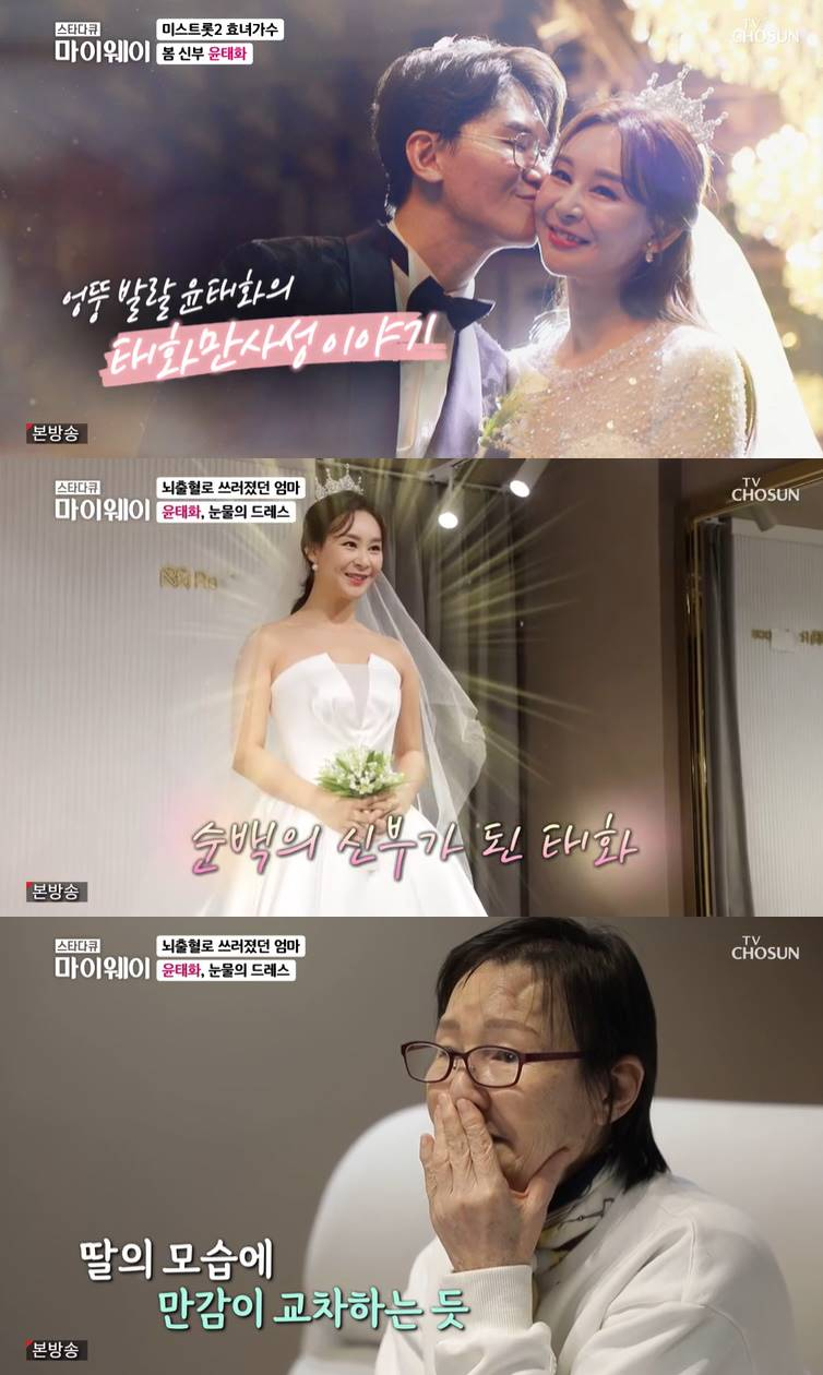 윤태화는 3일 방송된 TV조선 '스타다큐 마이웨이'에서 신랑을 최초 공개했다. 윤태화는 지난 3월 26일 서울 모처에서 8세 연상 비연예인 신랑과 결혼식을 올렸다. 두 사람은 3년 연애 끝에 웨딩마치를 울린 것.