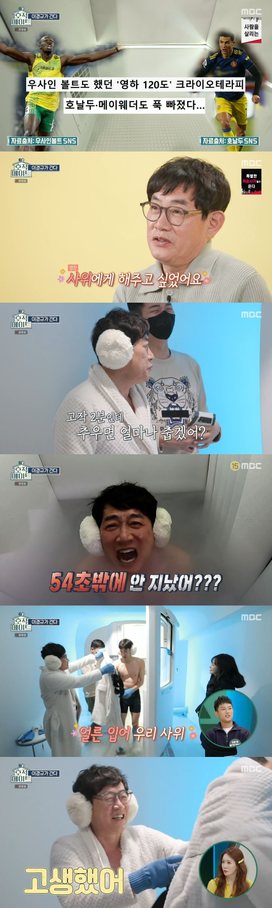 이날 방송에서 이경규는 "제가 경험한 재활 중에 최고였다"고 밝혔다. 이경규가 준비한 것은 다름 아닌 영하 110도 이하로 급속 냉각, 신체의 회복을 돕는 테라피다. 이경규는 "우사인 볼트와 호날두도 집에 두고 쓰는 거다"며 "부상 회복에도 도움이 된다. 빨리 회복하는 게 폼이 떨어지지 않거든. 그 얘기를 듣고 해주고 싶더라고요"라며 진심을 전했다.