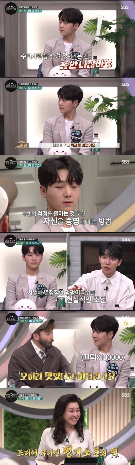 노홍철은 "그런데 어느 순간 그런 생각을 했다. 주변 사람들을 걱정시키는 것 역시 폼이 안 나지 않느냐. 그래서 마음을 먹고 목표를 바꿨다. 주변의 걱정을 줄이는 것 또한 나 자신을 증명하는 방법이라 생각했다"고 말했다. 이에 펑펑이는 "마음이 움직였다. 앞으로 저축을 늘리겠다. 옆에서 노홍철씨의 얘기를 듣는데 창피했다"며 앞으로 저축에 들이는 돈을 늘리겠다고 말했다. 이에 노홍철은 "오히려 증명하는 것을 보더니 멋있다고 하더라"며 펑펑이의 선택을 응원했다.