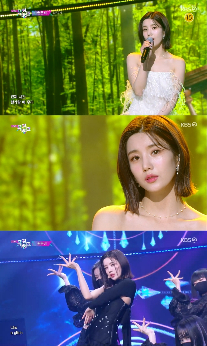 권은비는 8일 오후 KBS 2TV '뮤직뱅크'에 출연해 두 번째 미니 앨범 '컬러(Color)'의 수록곡 '우리의 속도'와 타이틀곡 '글리치(Glitch)' 무대를 선보였다.