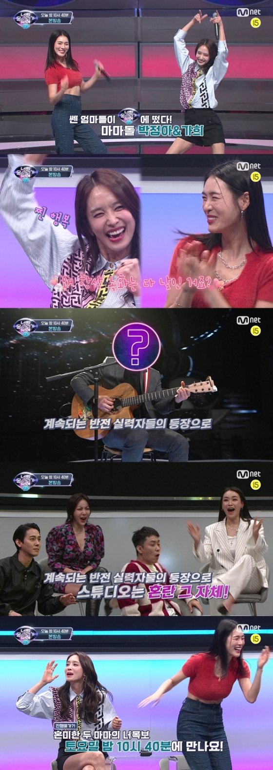 마마돌 활동을 통해 레전드 아이돌임을 증명한 박정아와 가희는 "왜 항상 녹화는 낮에 하는거냐"며 오랜만에 육아를 벗어난 기쁨을 감추지 못해 웃음을 안겼다. 두 사람은 시작부터 높은 텐션과 찐 행복한 미소로 긍정 에너지를 발산, 미스터리 싱어들과의 대결을 기대하게 만들었다.