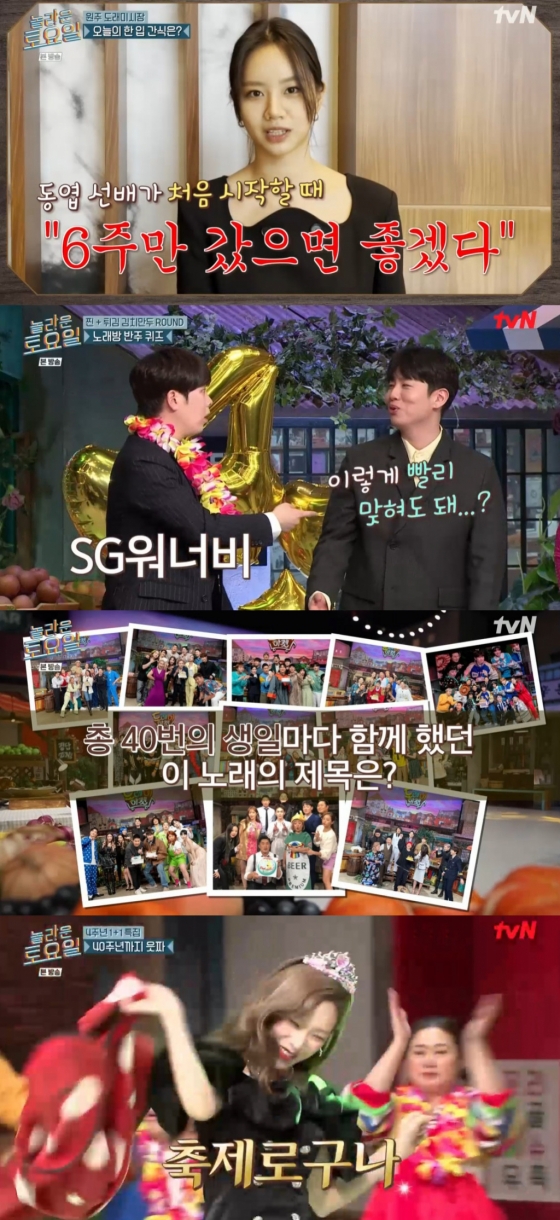 깜짝 등장한 혜리는 "'놀토' 4주년을 축하드린다. 동엽 선배가 처음 시작할 때 6주만 갔으면 좋겠다고 한 게 엊그제 같은데 시간이 이렇게 됐다. 평생 40주년, 400주년까지 하길 바란다"라고 응원했다.