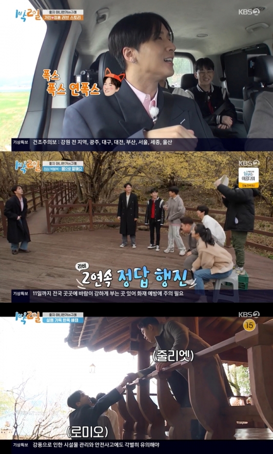 봄나물 비빔밥을 먹고 한옥 베이스캠프로 이동한 라비는 정자에서 문세윤과 함께 능청스럽게 로미오와 줄리엣을 연기해 웃음을 안겼다. 베이스캠프를 구경한 뒤 달콤한 휴식 시간을 가진 라비와 한가인, 멤버들은 이어서 '1박 2일'의 꽃 저녁 복불복을 진행했다.