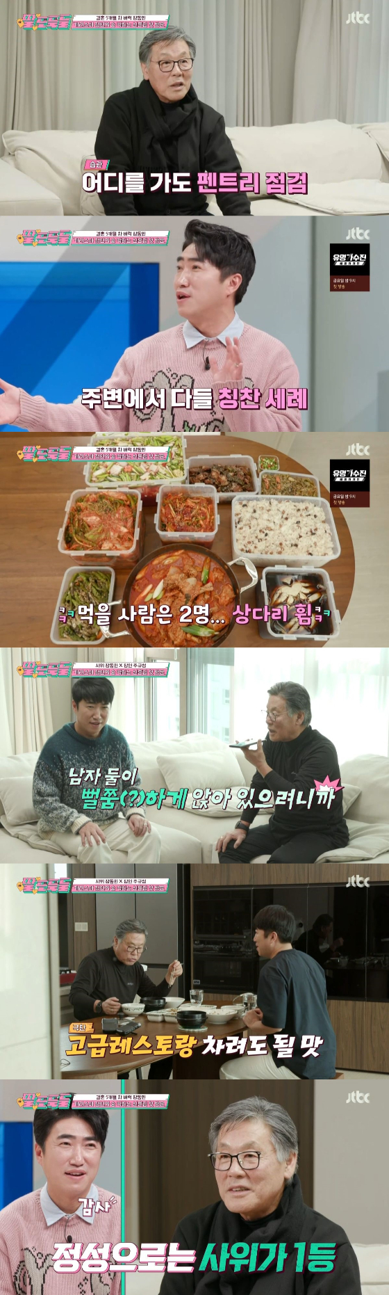 이어 장동민은 음식을 가득 싸준 장모님께 전화를 걸어 감사 인사를 전했다. 주규성은 "자네가 왔어야 했다"며 "남자 둘이 뻘쭘하게 앉아 있으니까 답답하다"고 심경을 토로했다. 이후 장동민은 당뇨가 있는 주규성을 위해 굴국, 시금치 샐러드, 솥 밥을 만들었다. 이에 주규성은 "고급 레스토랑 차려도 되겠다"라며 극찬했다.