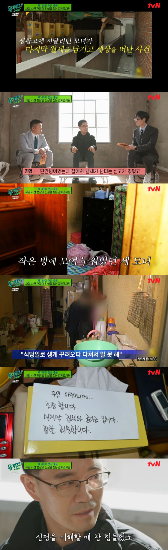 '유 퀴즈 온 더 블럭'에서 유재석이 '송파구 세 모녀 사건'을 맡았던 담당 검시 조사관의 설명을 듣고 안타까운 마음을 내비쳤다.