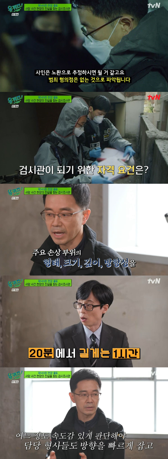 13일 오후 방송된 tvN '유 퀴즈 온 더 블럭' 149회에서는 사망 사건 현장에 가장 먼저 출두해 범죄 수사 방향을 잡아주는 검시조사관 김진영 자기님이 출연하는 모습이 담겼다.